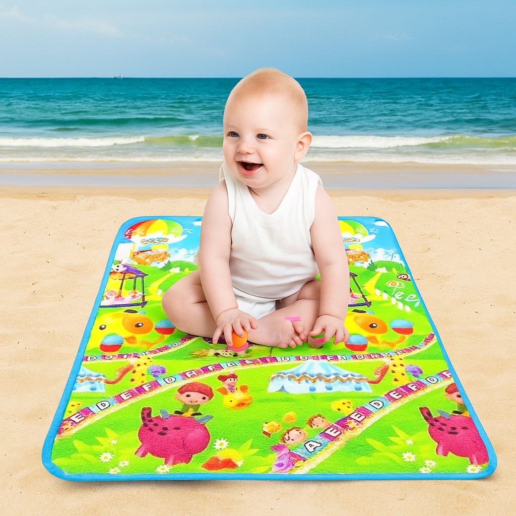 O tapetinho emborrachado protege da areia quente (diferente das cangas e esteiras) e se torna um lugar protetivo para o bebê. Além do mais ele é fácil de limpar, é só passar um pano úmido.