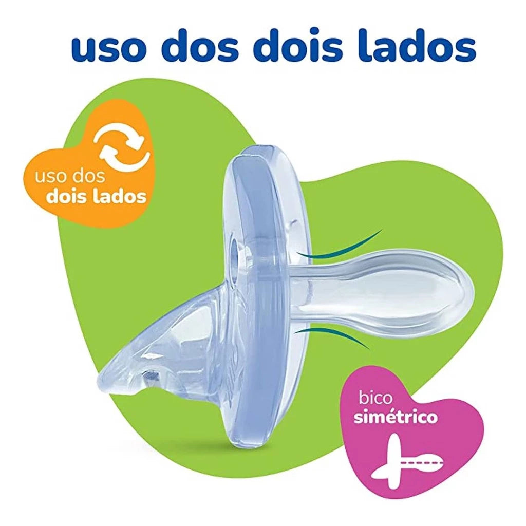 O formato do bico permite o uso da chupeta dos dois lados. Acompanha estojo esterilizável e reutilizável para higienização e transporte.