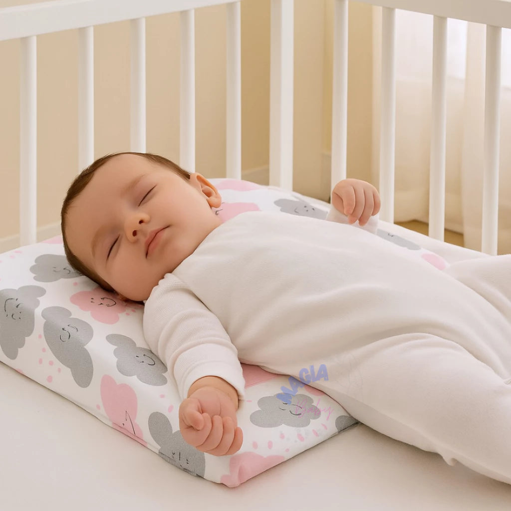 O travesseiro de bebê antirrefluxo é projetado para ajudar a prevenir o refluxo gastroesofágico. Ele é feito de materiais macios e confortáveis, como espuma de poliuretano, e tem uma inclinação suave para elevar a cabeça e o tronco do bebê enquanto ele dorme.